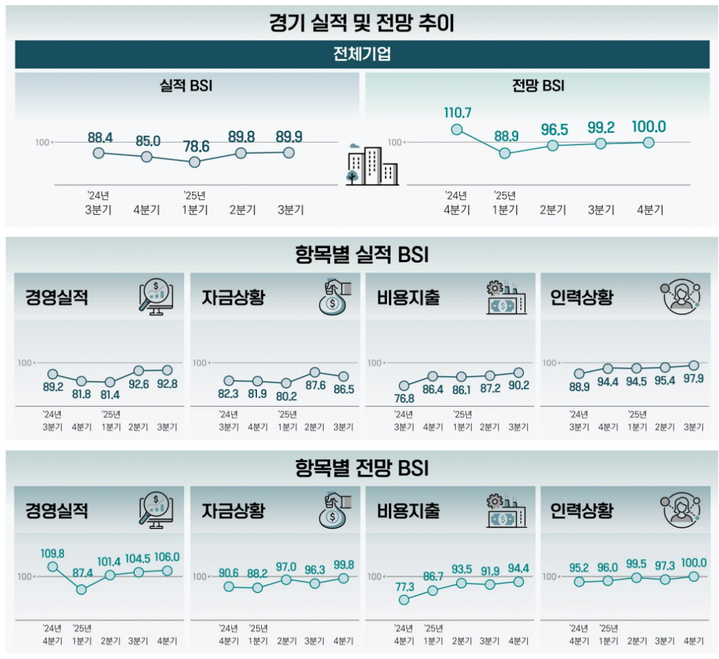 3분기 경기실적지수는 89.9로 전 분기(89.8) 대비 0.1포인트 상승했다. 1분기 저점(78.6)에서 반등한 이후 2분기 연속 개선 흐름을 이어가고 있다.