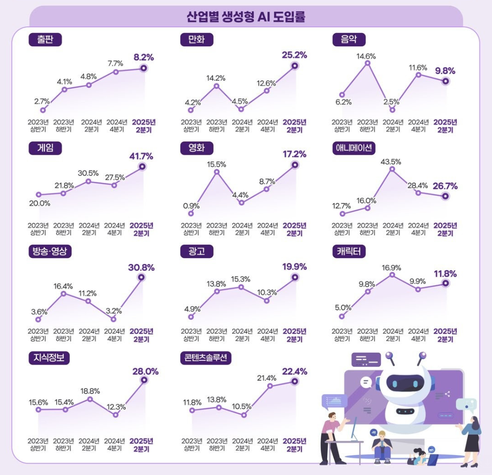 2025년 상반기 국내 콘텐츠산업의 생성형 AI 활용률이 20.0%를 기록하며 전년 대비 7.1%포인트 증가한 것으로 나타났다. 이는 한국콘텐츠진흥원이 1일 발표한 ‘2025년 2분기 콘텐츠산업 동향분석’ 보고서를 통해 확인됐다.
