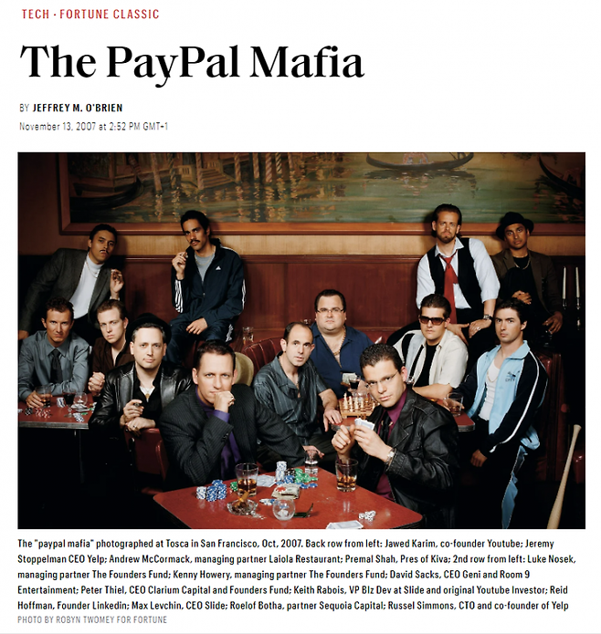 사진 속 인물들의 이름을 보면 놀랍다. 피터 틸, 리드 호프먼, 스티브 첸, 채드 헐리, 제러미 스토플먼, 자웨드 카림… 사진을 찍던 2007년 당시 이들은 이미 유튜브, 링크드인, 옐프를 만든 사람들이었다. 일론 머스크는 촬영에 참석하지 못했지만, 그 역시 페이팔 출신이었다.
