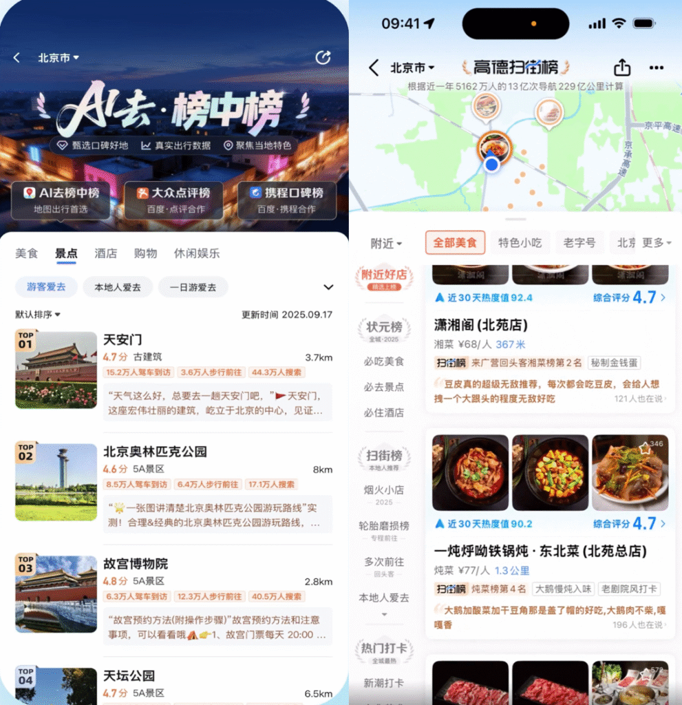이에 바이두(百度)도 조용히 반격에 나섰다. 신규 업데이트를 통해 ‘AI취•랭킹 오브 랭킹(AI去•榜中榜) 서비스를 선보였는데 이 역시 실제 이동 데이터를 기반으로 한 로컬생활 추천 랭킹이다. 바이두와 알리바바의 차이점은 동맹군이다. 바이두는 자체 생태계만으로 알리바바와 같은 거래 클로즈드 루프를 만들기 어려운 탓에 메이투안(美团), 씨트립(Ctrip, 携程, 글로벌 서비스명: 트립닷컴)과 손을 잡았다. ‘AI취•랭킹 오브 랭킹’에는 바이두의 랭킹과 함께 메이투안의 따중디엔핑(大众点评) 랭킹과 씨트립 입소문 랭킹이 표시되며 사용자는 지도 내에서 바로 해당 플랫폼으로 이동해 상품 구매 및 예약을 진행할 수 있다.