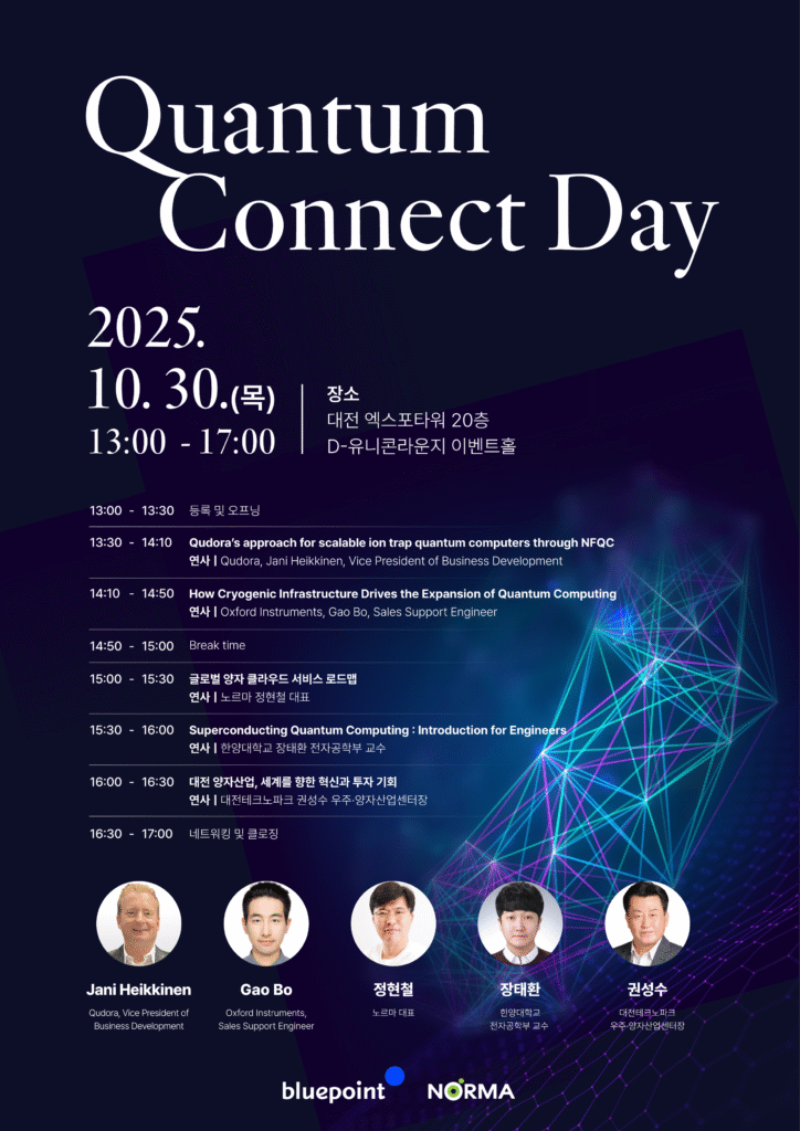 노르마 회차에서는 글로벌 양자 클라우드 서비스 로드맵을 중심으로 큐도라(Qudora,) 옥스포드 인스트루먼트(Oxford Instruments), 한양대, 대전테크노파크등 국내외 주요 기관이 극저온 인프라, 초전도 양자컴퓨팅, 지역 산업 혁신 및 투자 전략을 발표한다.