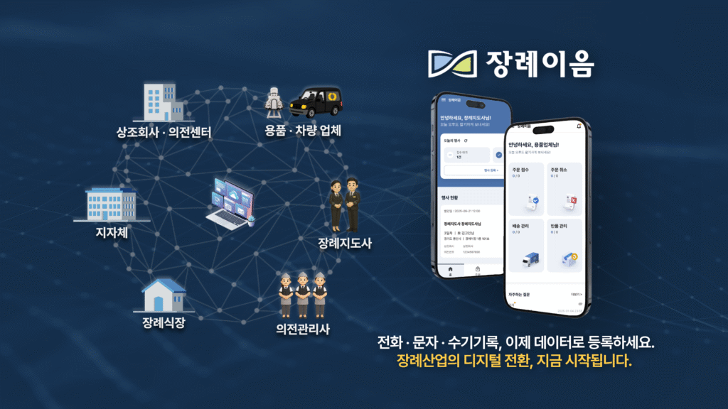장례이음은 상조회사, 장례식장, 의전업체, 장례지도사 등 관련 주체들이 표준화된 절차에 따라 협업하도록 설계되었다. 상조회사 본사는 전국 단위 행사 진행 현황 및 현장의 거래, 의전 상태를 실시간으로 확인할 수 있다. 현장 장례지도사는 주문 및 의전 과정을 앱을 통해 간편하게 등록할 수 있어 기존 수기 기록의 부담을 줄였다.