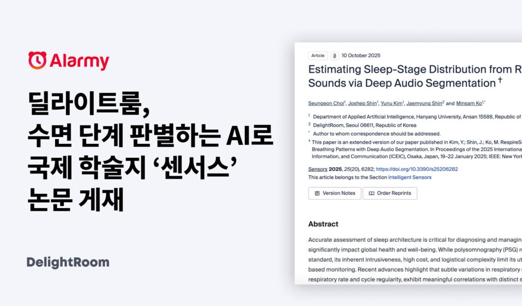 글로벌 수면-기상 솔루션 ‘알라미’ 운영사 딜라이트룸이 수면 호흡 분석을 통한 수면 단계 판별 인공지능(AI) 모델 연구 논문을 센서 기술 분야 SCI급 국제 학술지 ‘센서스'(Sensors)에 발표했다.