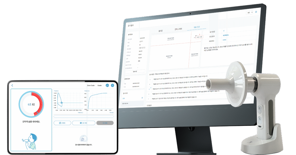티알의 폐기능 검사기 ‘더스피로킷(The Spirokit)’은 AI가 데이터를 기반으로 검사 결과를 자동 분석하며, 만성 폐쇄성 폐질환 전 단계(Pre-COPD) 측정 기능을 제공한다. 다양한 기관지 유발 검사 지원, 다국어 기능 등을 갖추고 있다.