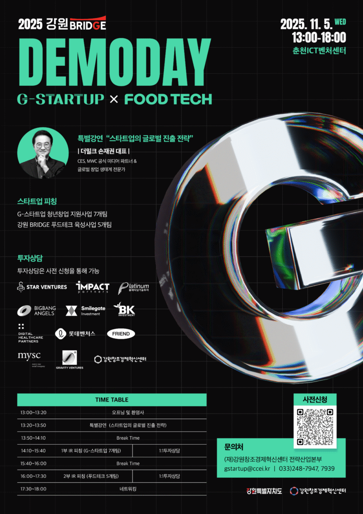 이번 행사에는 강원혁신센터가 운영하는 G-스타트업 청년창업 지원사업과 강원 BRIDGE 푸드테크 육성사업 참여기업 12개사가 참가한다. 참가 기업들은 기술력과 사업 성과를 소개하고 투자 유치 및 협력 기회를 모색한다.