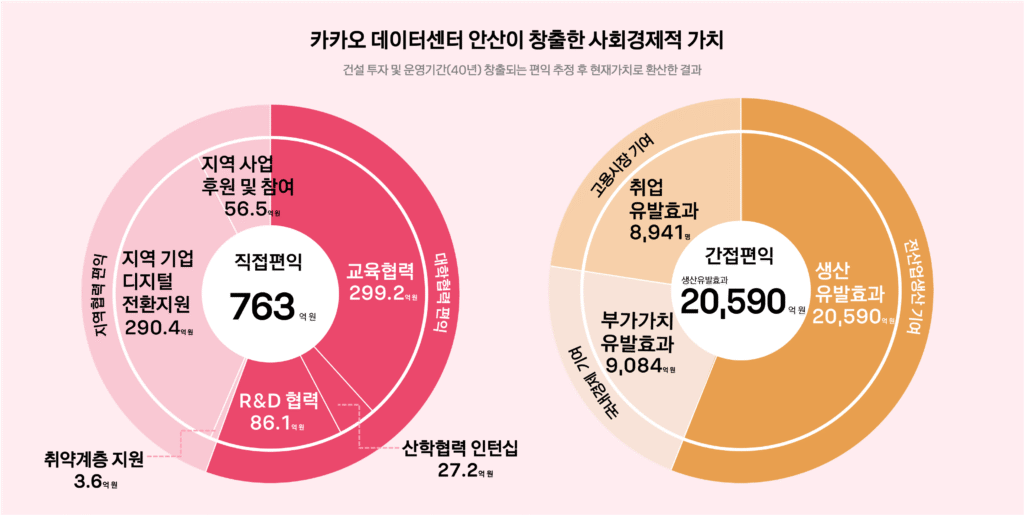 연구에 따르면 카카오 데이터센터 안산은 향후 40년의 운영 기간 동안 직접편익 763억 원과 생산유발효과 2조 590억 원, 부가가치유발효과 9천84억 원, 취업유발효과 8천941명에 달하는 간접편익을 창출할 것으로 분석됐다.