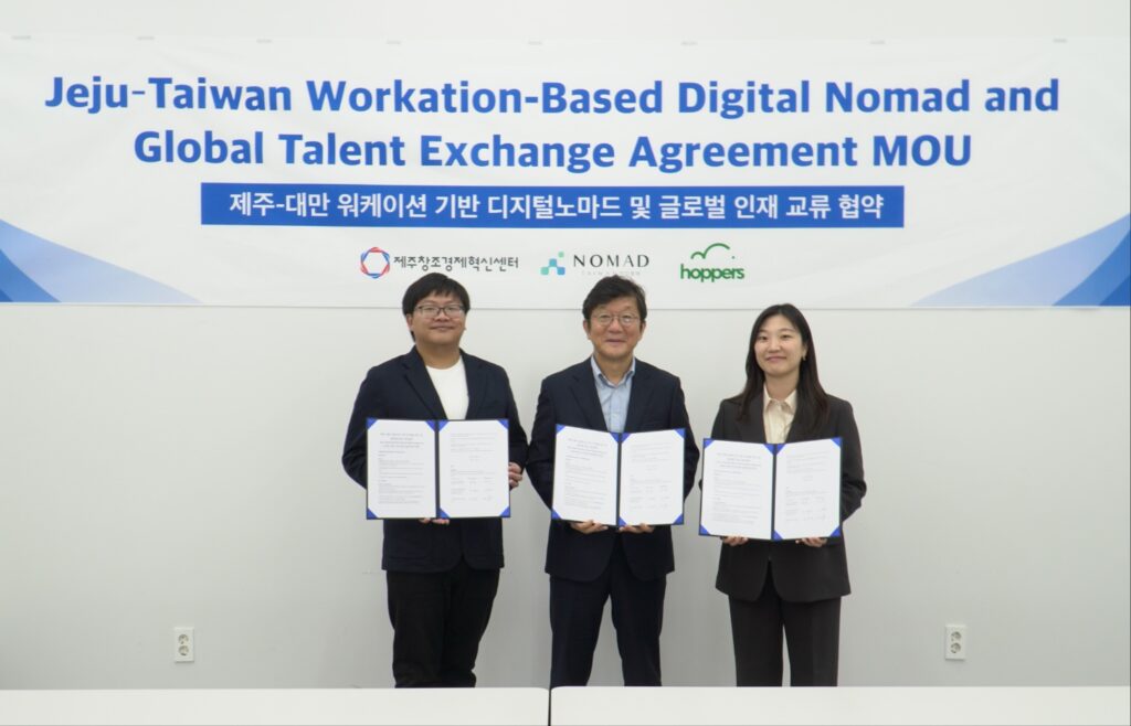 제주창조경제혁신센터가 24일 대만 국가발전위원회 노마드 타이완 오피스, 호퍼스와 제주-대만 워케이션 기반 디지털노마드 및 글로벌 인재 교류 협약을 체결했다.