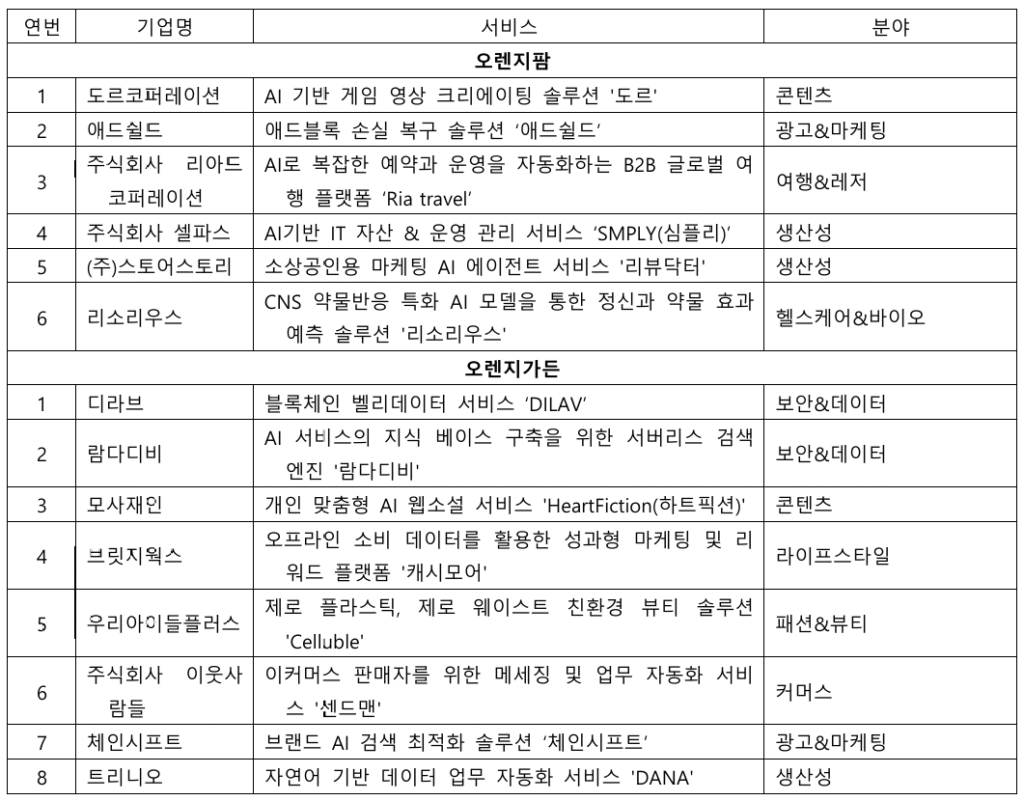 오렌지가든에는 블록체인 멀티다이어리 서비스 ‘DILAV’의 디라브, AI 서비스의 지식 베이스 구축을 위한 서비스 검색 엔진 ‘닥터디바’의 닥터디바, 개인 맞춤형 AI 웹소설 서비스 ‘HeartFiction(하트픽션)’의 모사재인, 온프라인 스퀘 데이터를 활용한 성과형 마케팅 및 리워드 플랫폼 ‘캐시모아’의 브릿지워크스, 제로 플라스틱, 제로 웨이스트 친환경 뷰티 솔루션 ‘Celluble’의 우리아이돌플러리스, 이커머스 판매자를 위한 매체장 및 업무 자동화 서비스 ‘샌드맨’의 주식회사 이웃사람들, 브랜드 AI 검색 최적화 솔루션 ‘체인시프트’의 체인시프트, 자연어 기반 데이터 업무 자동화 서비스 ‘DANA’의 트리니오 등 8개 팀이 선발됐다.