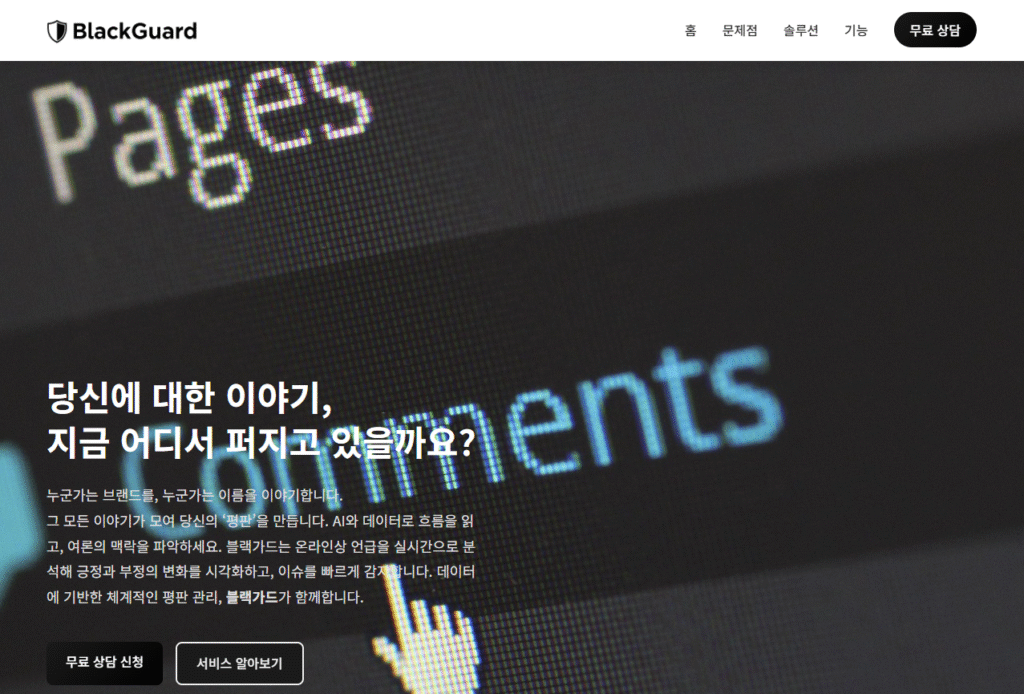 ‘블랙가드’는 AI를 활용해 온라인상 브랜드 및 셀럽의 평판을 실시간으로 모니터링·분석하는 서비스로, 댓글·게시글·커뮤니티 등 다양한 플랫폼 데이터를 수집해 악성 게시물, 허위 정보, 여론의 긍정·부정 흐름을 보여준다.