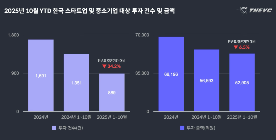 2025년 1월부터 10월까지 누적 실적은 투자 건수 889건, 투자 금액 5조2천905억원으로 기록됐다. 전년 동기 대비 투자 건수는 34.2% 감소했으나, 투자 금액의 감소폭은 6.5%로 상대적으로 작았다.