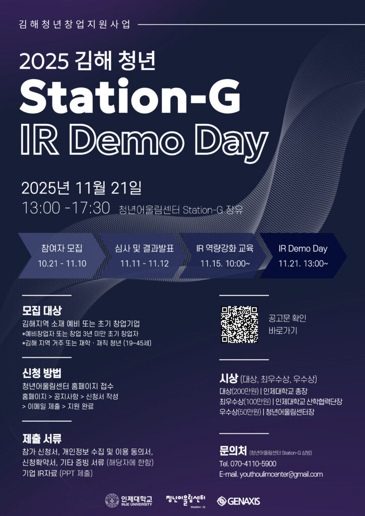 액셀러레이터 젠엑시스가 인제대학교 산학협력단과 청년어울림센터 Station-G가 주관하는 ‘2025 김해 청년 Station-G IR Demo Day’ 참가 기업을 모집한다.
