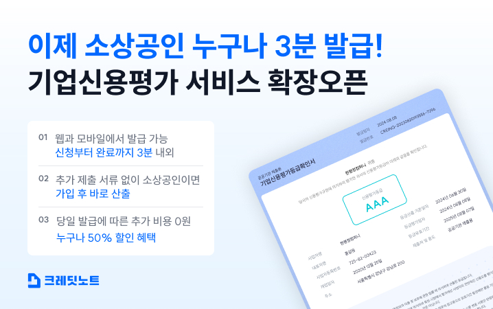 ‘3분 보고서 발급 서비스’는 한국평가정보가 운영하는 소상공인 신용평가 플랫폼 ‘크레딧노트(Credit Note)’의 핵심 기능 중 하나다. 사용자는 홈택스 인증만으로 사업 실적 기반의 신용평가 등급을 즉시 확인할 수 있으며, 해당 등급확인서는 조달청 나라장터 등 주요 공공기관 입찰 시 필수 제출 서류로 활용된다.
