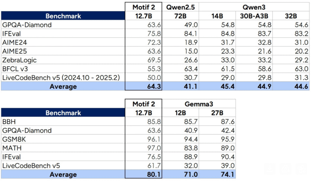 벤치마크 결과, Motif 12.7B는 추론 능력을 평가하는 수학, 과학, 논리 과제(AIME25, GPQA-Diamond, 지브라로직 등)에서 720억 매개변수를 가진 알리바바 Qwen 2.5(72B)를 능가했다. 또한 구글 Gemma 동급 모델과의 비교에서도 주요 추론 능력 평가 지표에서 더 나은 점수를 얻었다.
