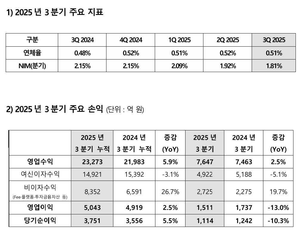 대출을 통한 이자수익이 감소했음에도 비이자수익이 성장하면서 전체 영업수익 증가를 견인했다. 대출이자수익을 제외한 비이자수익은 3분기 누적 8352억 원으로 전년 동기 대비 26.7% 증가했다. 전체 영업수익(2조 3273억 원) 중 비이자수익의 비중은 36%로 전년(30%)과 비교해 6%포인트 높아졌다.