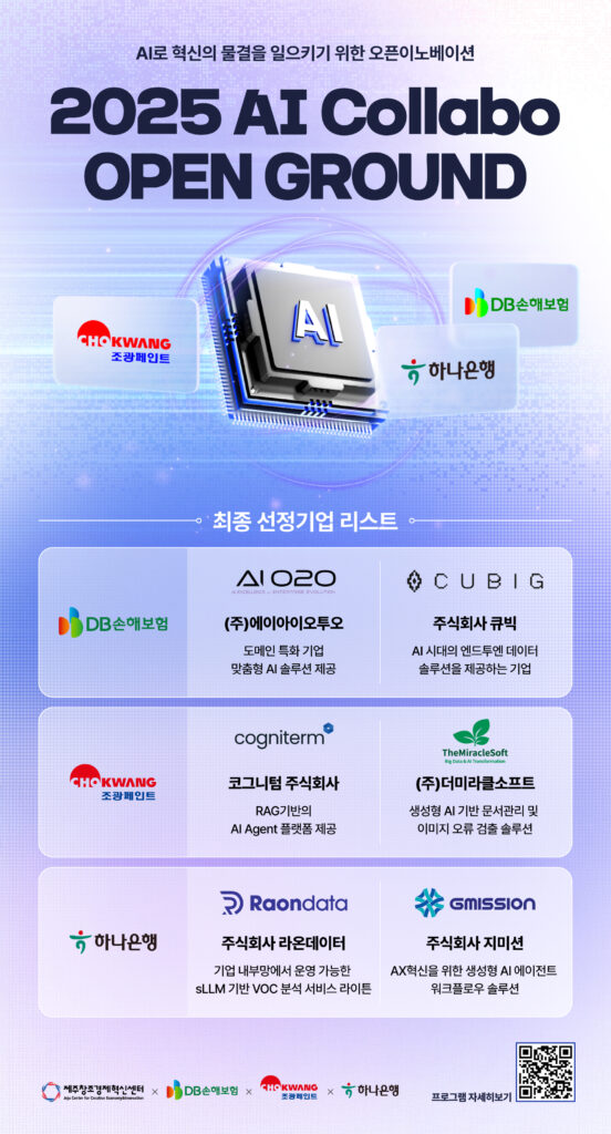 제주창조경제혁신센터가 DB손해보험, 조광페인트, 하나은행과 함께 추진하는 특화산업 오픈이노베이션 ‘2025 AI 콜라보 오픈그라운드 프로그램’을 통해 최종 6개 스타트업을 선정하고, 사업화 협력에 나선다.