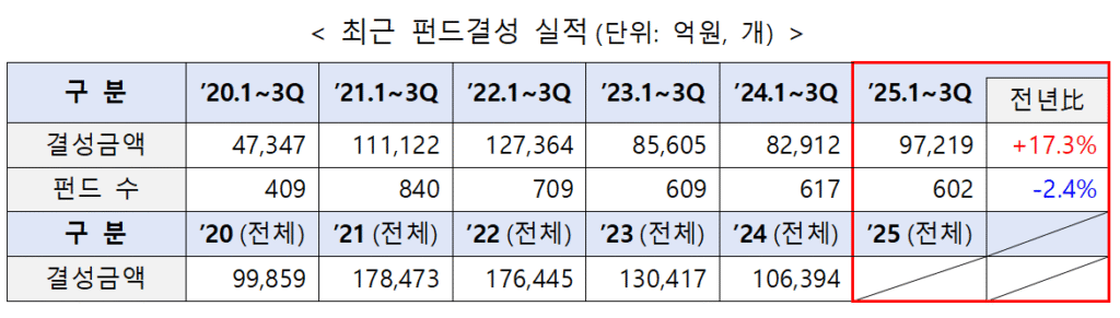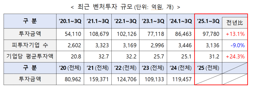 중소벤처기업부가 13일 발표한 ‘2025년 3분기 벤처투자 및 펀드결성 동향’에 따르면, 올해 1~3분기 신규 벤처투자는 9조8000억원으로 전년 동기 대비 13.1% 증가했다. 같은 기간 벤처펀드 결성 규모는 9조7000억원으로 17.3% 늘었다.