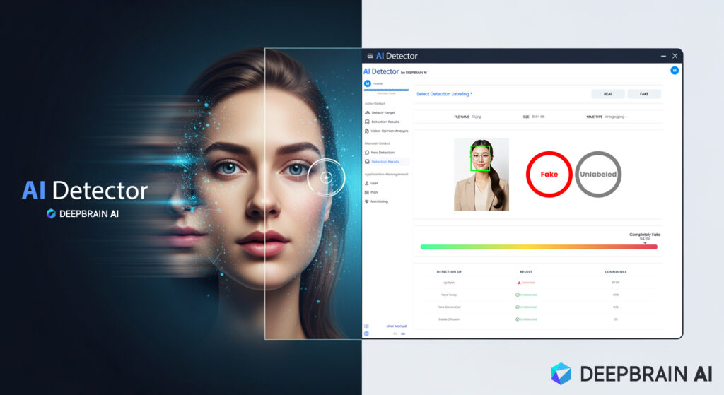 딥브레인AI의 딥페이크 탐지 솔루션 ‘AI 디텍터(AI Detector)’는 공공기관, 금융, 교육 등 산업 현장에서 활용되고 있다. 이 솔루션은 픽셀 차이를 분석해 딥페이크 여부를 판별하며, 관공서 대상 상용화 사례가 있다.