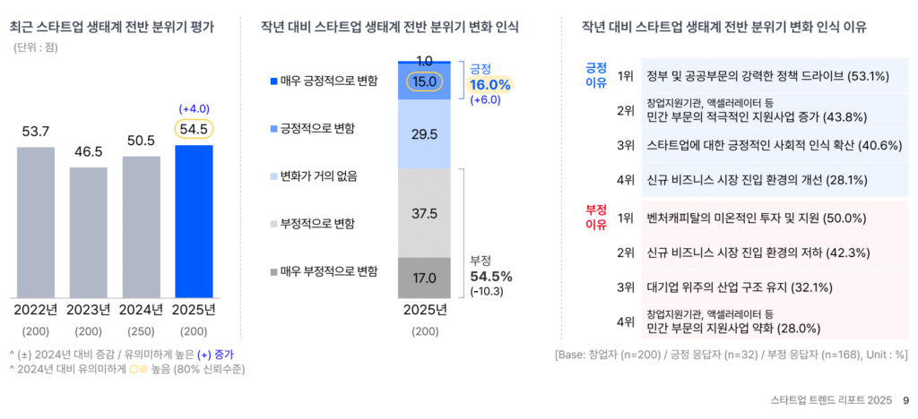 창업자들이 평가한 올해 스타트업 생태계 분위기는 100점 만점에 54.5점으로, 2년 연속 상승세를 기록했다. 지난해 대비 생태계 분위기가 긍정적으로 변했다는 응답은 2023년 9%, 2024년 10%에서 2025년 16%로 증가했고, 부정적 변화 응답은 감소했다.