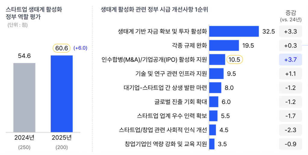 창업자들이 가장 시급한 정부 과제로 꼽은 항목은 ‘생태계 기반 자금 확보 및 투자 활성화'(32.5%), ‘각종 규제 완화'(19.5%), ‘M&A·IPO 활성화 지원'(10.5%) 순이었다. 특히 M&A·IPO 관련 응답은 전년 대비 3.7%포인트 증가해 회수시장 활성화에 대한 기대가 커지고 있음을 보여줬다.