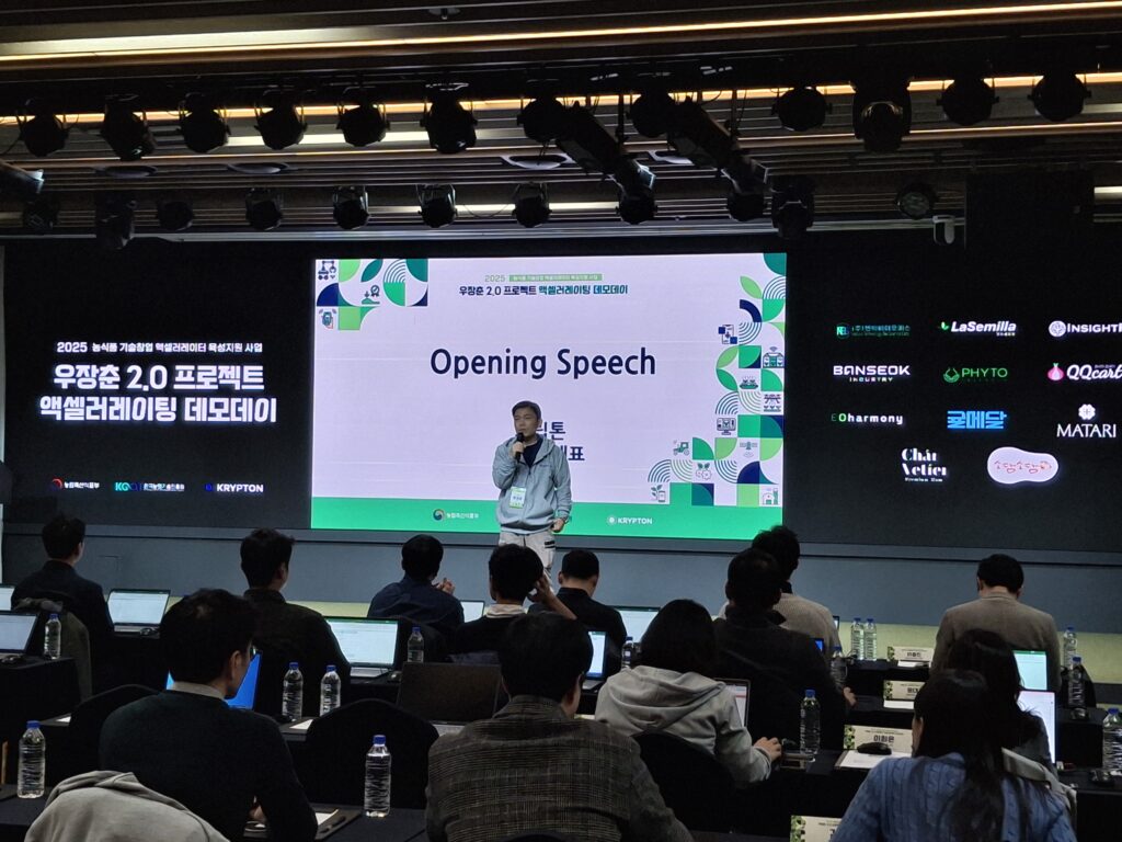 우장춘 2.0 프로젝트는 농림축산식품부와 한국농업기술진흥원이 주관·주최하고 크립톤이 운영하는 농식품 기술창업 전문 액셀러레이션 프로그램이다. 이번 데모데이는 농식품 투자사, 대기업 오픈이노베이션 조직, 유통 MD, 기술 검증기관 등 50여 명이 참석한 비공개 행사로 진행됐다.
