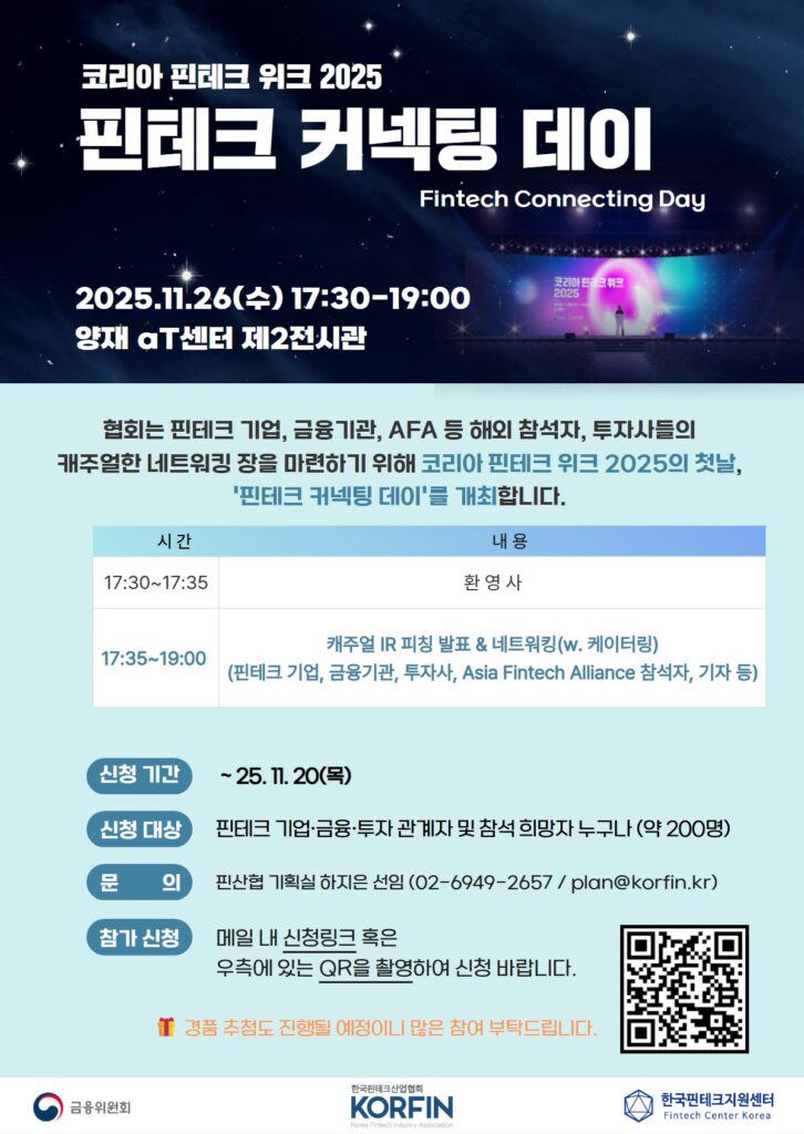 한국핀테크산업협회가 26일 양재 aT센터에서 열리는 ‘코리아 핀테크 위크 2025’에서 ‘핀테크 커넥팅 데이’를 개최한다.