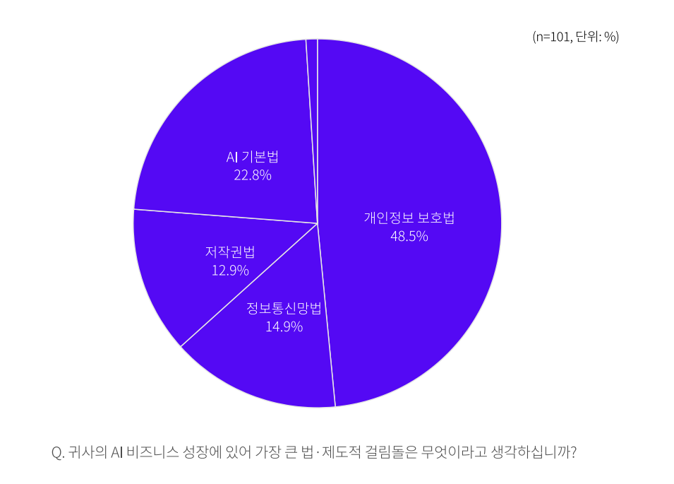 AI 비즈니스 성장에 가장 제약이 되는 법·제도를 묻는 질문에 개인정보보호법(48.5%)이 압도적 1위를 차지했다. 이어 AI 기본법(22.8%), 정보통신망법(14.9%), 저작권법(12.9%) 순으로 제약 요인으로 꼽혔다.