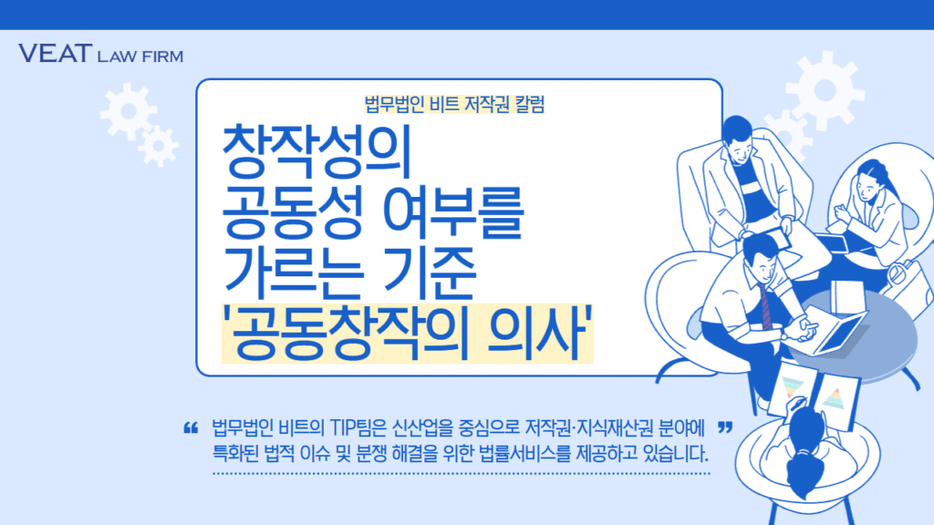 공동저작물에 대한 법률 자문이 필요하시거나 저작권 분쟁 대응에 대한 상담이 필요하시다면 언제든지 법무법인 비트 TIP팀에 문의하여 주시기 바랍니다.
