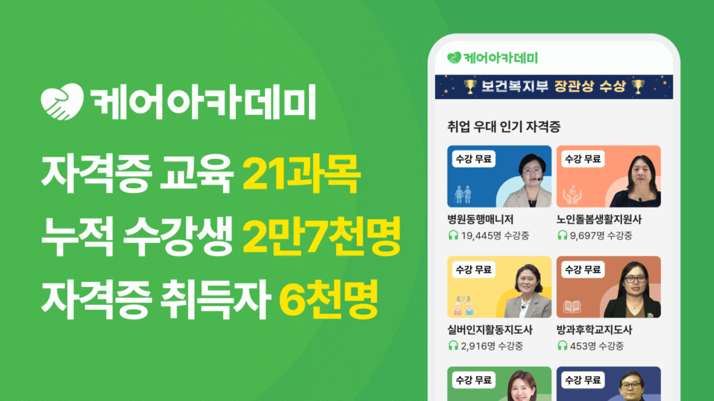 케어아카데미는 시니어의 새로운 직무 역량 강화를 지원하는 온라인 학습 플랫폼이다. 현재 병원동행매니저, 실버인지활동지도사, 노인돌봄생활지원사 등 총 21개 교육과정을 제공하고 있다. 지난 5월부터 약 5개월간 진행된 베타 서비스 기간 동안 누적 수강생 2만 7,000명, 자격증 취득자 6,000명을 기록했다.