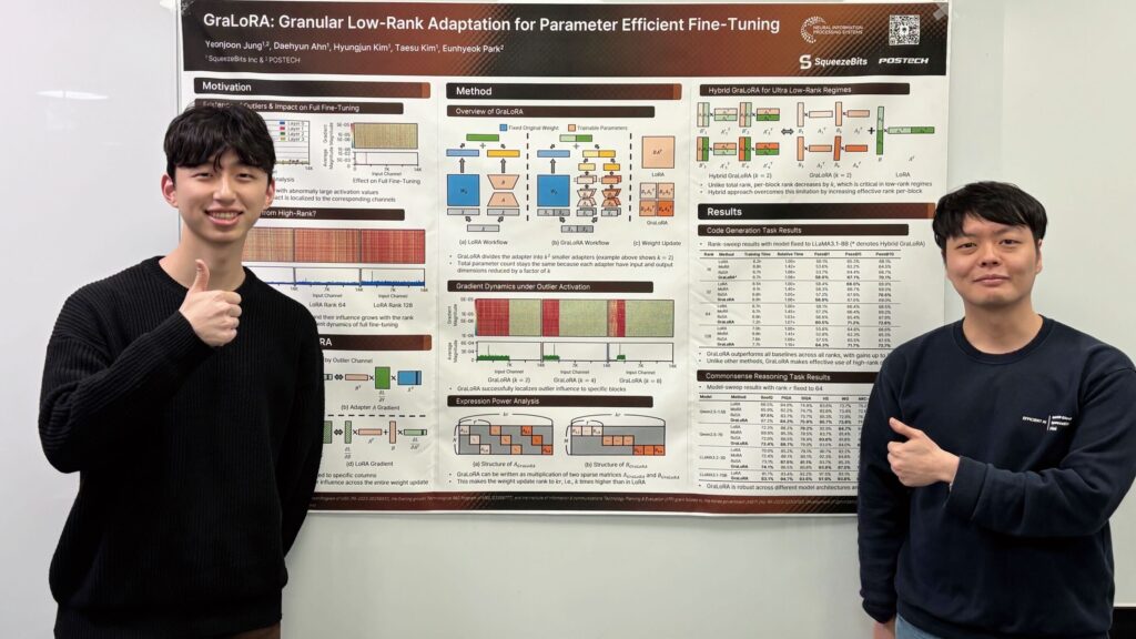 AI 경량화 기술 기업 스퀴즈비츠와 포스텍 박은혁 교수 연구팀이 공동 연구한 논문 ‘그래롤라(GraLoRA)’가 인공지능 학회인 뉴립스(NeurIPS) 2025에서 스포트라이트(Spotlight) 논문으로 선정됐다. 스포트라이트는 전체 제출 논문 중 상위 약 3.2%에 부여되는 등급이다.