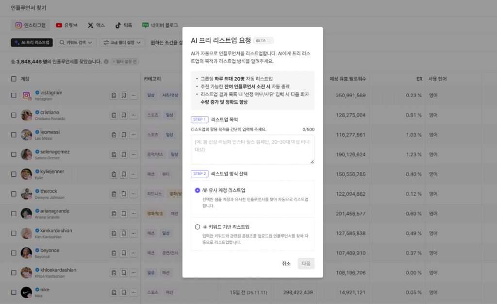 ‘AI 프리 리스트업’은 마케팅 실무자가 캠페인 기획 단계에서 인플루언서를 발굴하는 데 소요되는 시간을 단축하기 위해 개발된 자동화 기능이다. 기존의 필터링 검색 방식이 가진 한계를 보완하여, 자연어 검색을 기반으로 브랜드 이미지에 부합하는 후보군을 정교하게 탐색한다.