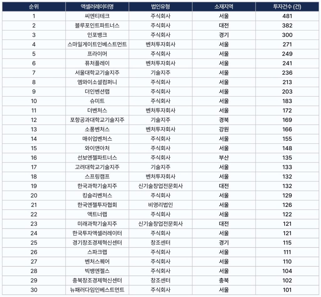 ‘2025 상반기 대한민국 액셀러레이터 산업백서’에 따르면 씨엔티테크가 2017년 제도 도입 이후 2025년 상반기까지 누적 481건의 투자를 집행해 국내 액셀러레이터(AC) 중 투자건수 1위를 기록했다. 블루포인트파트너스는 382건, 인포뱅크는 300건으로 뒤를 이었다.