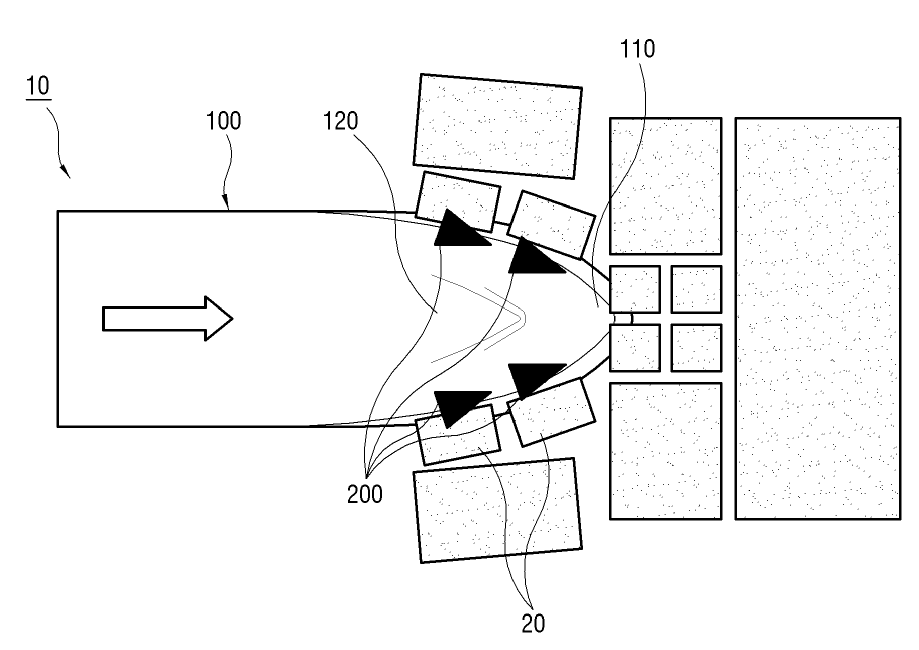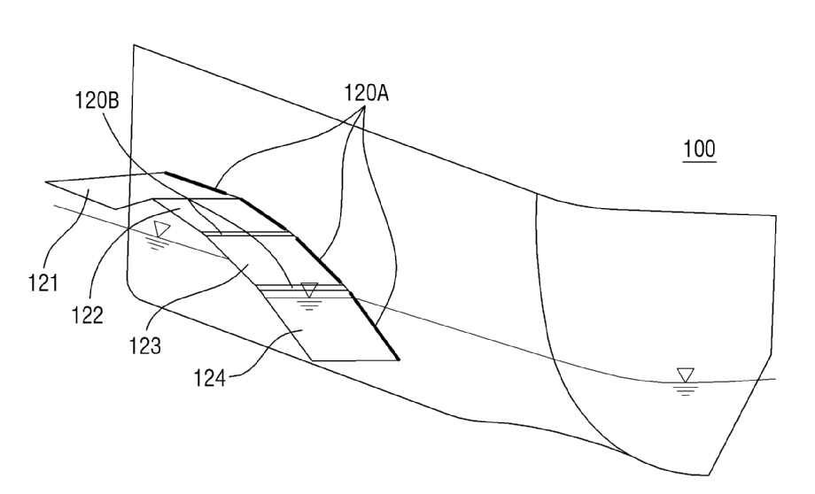 “빙편유입방지장치를 구비한 선박(출원번호 10-2021-0141849)” 발명은 문제 해결의 포인트를 선저 쪽으로 변경하였다. 선수 아래 선저부에 은폐된 공간과 도어, 빙편유입방지벽을 두고, 빙해 운항 시에는 이 장치를 아래쪽으로 돌출시켜 선저로 기어들어오는 빙편을 맞받아 튕겨내고 선측으로 흘려보내는 구조이다. 깨진 얼음 조각이 선저 개구부나 장비, 씨체스트 주변까지 들어오지 못하게 물리적으로 차단하는 것이다.