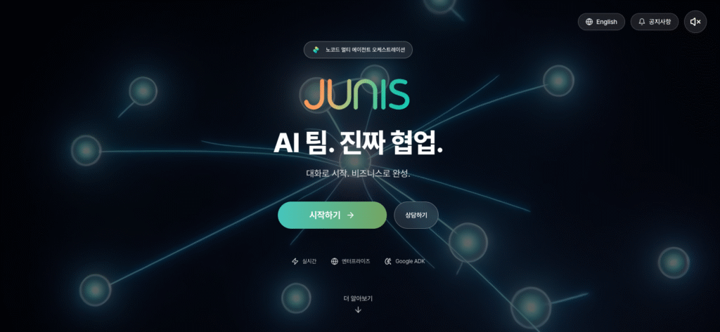 주니스는 ‘AI 팀 서비스(AI Team as a Service)’를 표방하는 솔루션으로, 여러 인공지능(AI) 에이전트가 자연어를 기반으로 실시간 협업하는 ‘다이내믹 에이전트 시스템’이다.