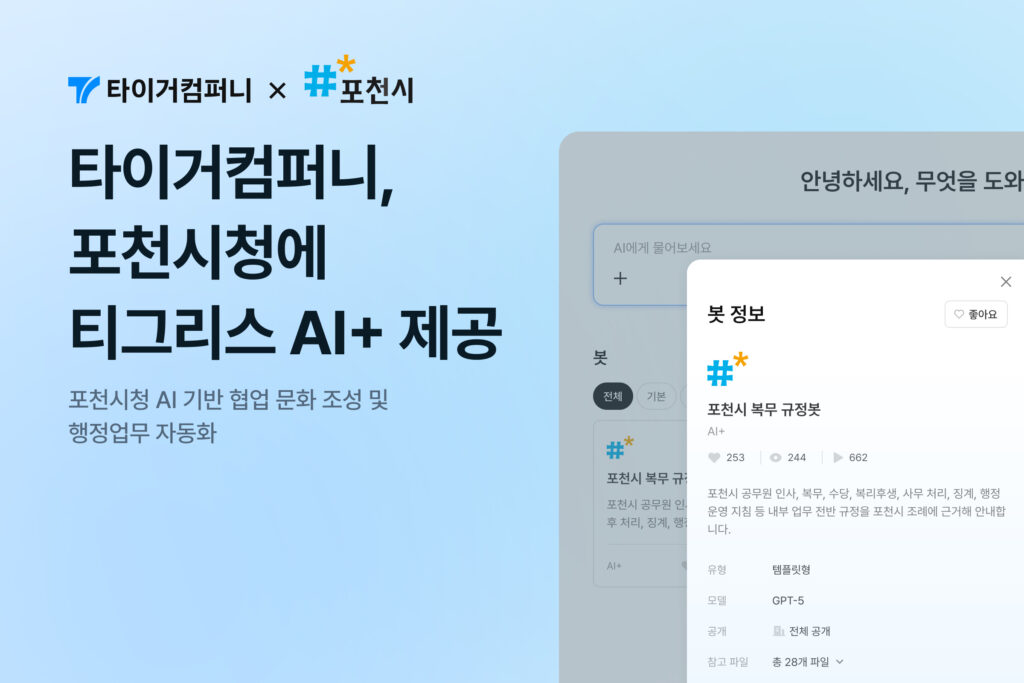 이번 솔루션 도입은 포천시청의 AI 기반 협업 문화 조성과 행정 업무 자동화를 위해 추진됐다. 포천시청은 주요 규정집과 민원 응대 자료 등을 학습한 맞춤형 AI 봇을 구축해 행정 업무의 효율성을 높일 계획이다. 이에 타이거컴퍼니는 티그리스 AI+ 활용법과 봇 제작 방법 등 실무 중심의 사용자 교육을 지원했다.