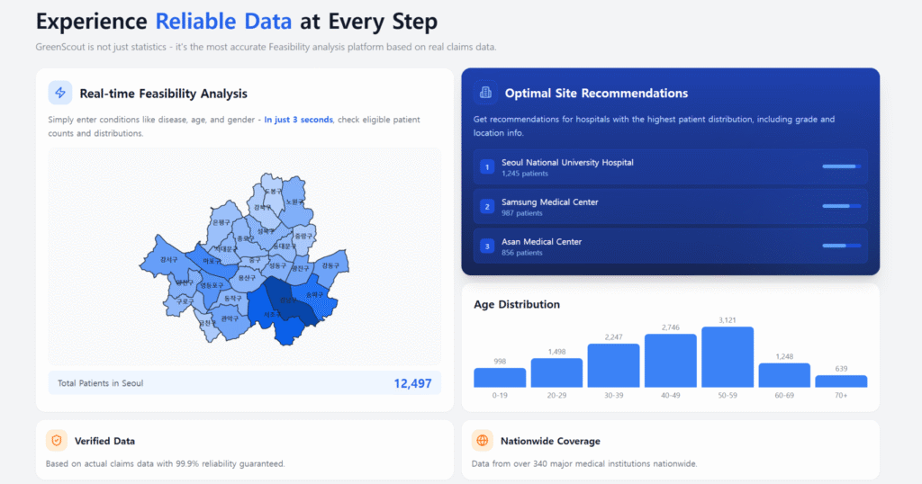 그린스카우트는 270만 명, 9억 건 이상의 실제 의료 데이터를 활용해 임상시험의 타당성을 분석하는 솔루션이다. 바이오 벤처와 제약사가 임상 초기 단계에서 겪는 환자 수 추정 오류나 부적절한 병원 선정으로 인한 비용 증가 및 연구 중단 문제를 해결하기 위해 개발됐다.