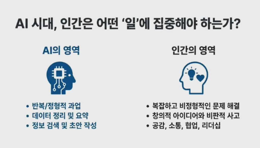 다섯째, AI가 할 수 없는 인간 고유의 능력을 강화하라. “좋은 질문을 던지는 능력, 명확하게 소통하는 능력, 효과적으로 협업하는 능력. 이것이 AI 시대의 경쟁력입니다.” 기술보다 본질적 역량이 중요하다.