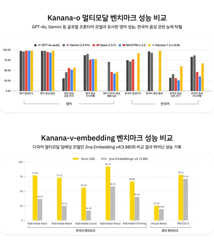 카카오는 12일 테크블로그를 통해 자체 개발한 멀티모달(Multimodal) AI 모델인 ‘Kanana-o(카나나-o)’와 ‘Kanana-v-embedding(카나나-v-임베딩)’의 성능 및 연구 성과를 공개했다.