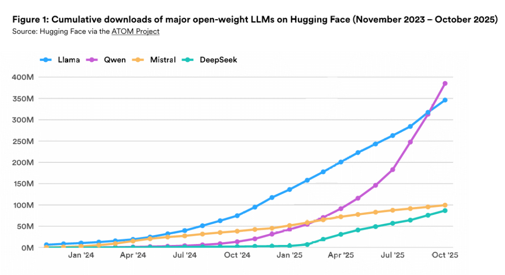 스탠포드 인간중심 AI연구소(HAI)와 사이버정책센터(SPC)가 12월 공동 발표한 ‘Beyond DeepSeek’ 보고서에 따르면, 2025년 9월 알리바바의 Qwen 모델 패밀리가 메타의 Llama를 제치고 허깅페이스 최다 다운로드 모델이 됐다. 같은 시점 허깅페이스 다운로드 점유율은 중국 개발사가 17.1%, 미국 개발사가 15.8%를 기록했다.