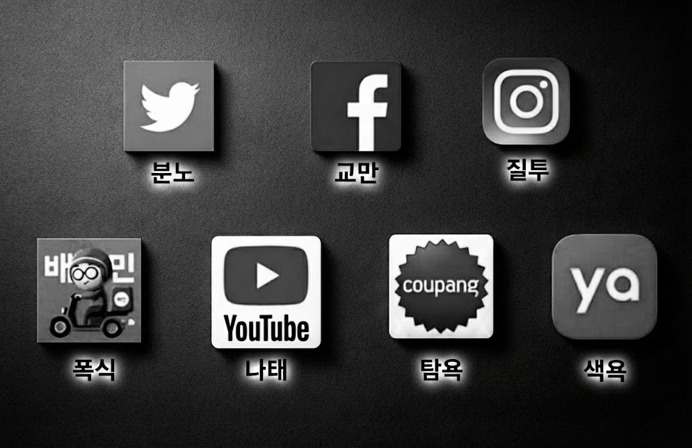 어느 날 인터넷에 밈 하나가 떠돌았다. ‘한국인의 7대 죄악’. 트위터는 분노, 페이스북은 교만, 인스타그램은 질투. 배달의민족은 폭식, 유튜브는 나태, 쿠팡은 탐욕, 야놀자는 색욕.
