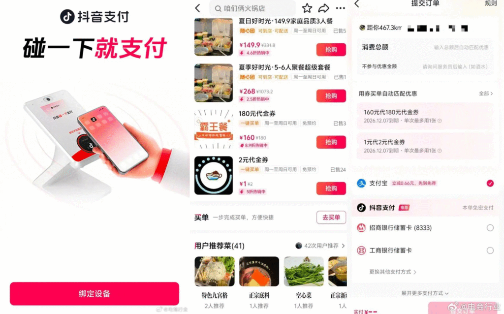 최근 도우인(글로벌 서비스명: TikTok) 앱에 추가된 도우인 마이단(도우인 결제) 기능은 상하이, 선전, 항저우 등 대도시를 중심으로 시범 서비스 중이다. 식당, 편의점, 마트, 레저 등 고빈도 오프라인 소비 영역을 공략하며, 체인 브랜드부터 동네 소상공인까지 파트너사를 확대하고 있다.