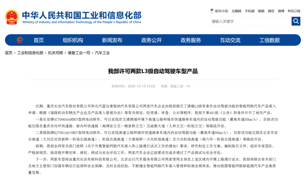 15일 중국 공업정보화부(공신부)는 제401차 도로 이동 차량 제조기업 및 제품 공고를 통해 두 종류의 L3급 조건부 자율주행 차량에 대해 ‘부분 조건부 제품 진입 허가’를 발표했다. 승인 대상은 충칭창안(重庆长安)의 SC7000AAARBEV형 순전기 세단과 베이징자동차(BAIC)의 아크폭스(ARCFOX) BJ7001A61NBEV형 순전기 세단이다.
