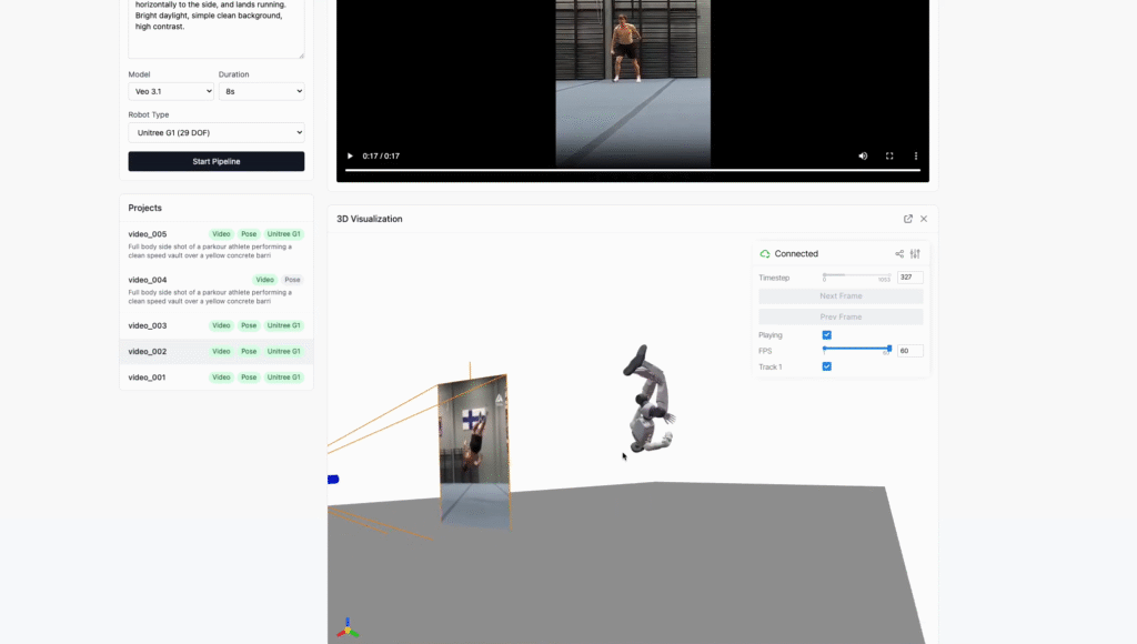공개된 ‘Video2Robot’은 오픈소스 파이프라인으로, 영상 속에 등장하는 인간의 동작을 분석하여 로봇이 학습할 수 있는 데이터로 변환하는 엔진이다.
