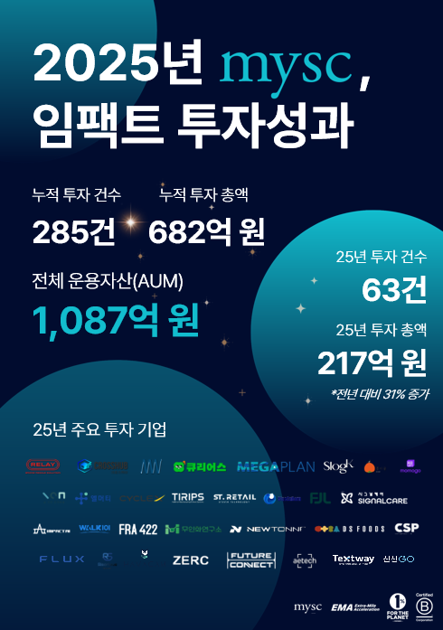 임팩트 투자사 엠와이소셜컴퍼니(MYSC)가 2025년 연간 투자 실적과 운용 현황을 공개했다.