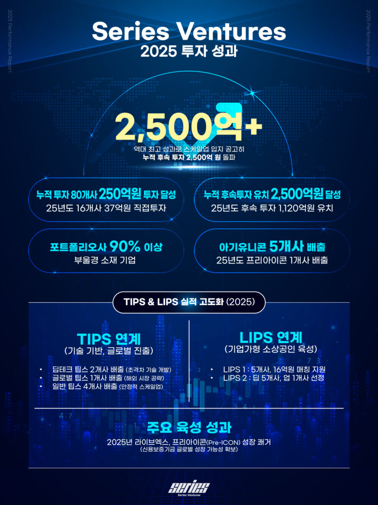 시리즈벤처스는 현재까지 약 80개 기업에 총 250억원 규모의 직접 투자를 집행했으며, 2025년에는 16개사에 37억원을 신규 투자했다. 포트폴리오사 ‘라이브엑스’가 신용보증기금의 프리아이콘(Pre-ICON) 기업으로 선정됐고, 누적 아기유니콘 배출 기업은 5개사에 달한다.