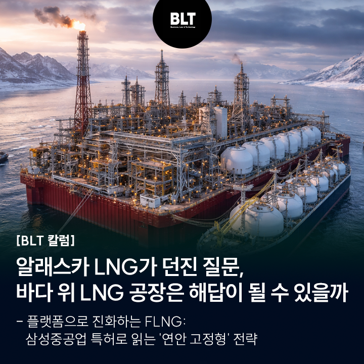 특히 삼성중공업의 2023~2024년 FLNG 특허 출원들은 FLNG를 일회성 프로젝트가 아닌 제품군으로 확장하려는 전략을 보여준다. 핵심은 ‘연안 고정형’과 ‘반복 가능한 플랫폼화’이다. 알래스카 이슈는 곧 FLNG의 방향성을 묻는 질문이 된다. 즉, 육상 중심 해법이 부담스러울 때 ‘연안형·고정형 해상 액화 패키지’가 얼마나 설득력 있는 대안이 될 수 있는지, 또 누가 이를 실현할 수 있는지를 묻는 것이다.