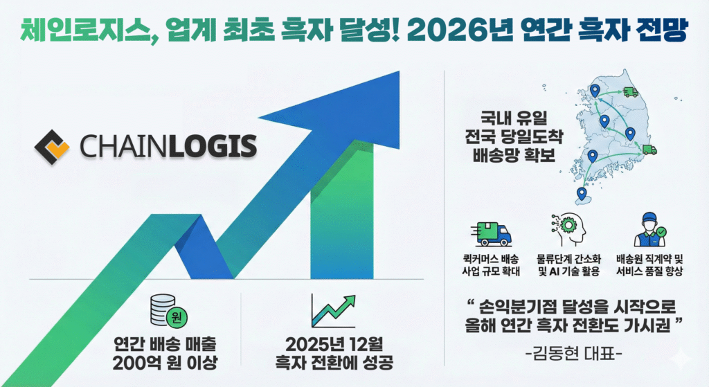 김동현 체인로지스 대표는 “월간 손익분기점 달성을 시작으로 올해 연간 흑자 전환도 가시권에 들어왔다”며 “배송 속도 경쟁력을 기반으로 성장을 이어가겠다”고 밝혔다.