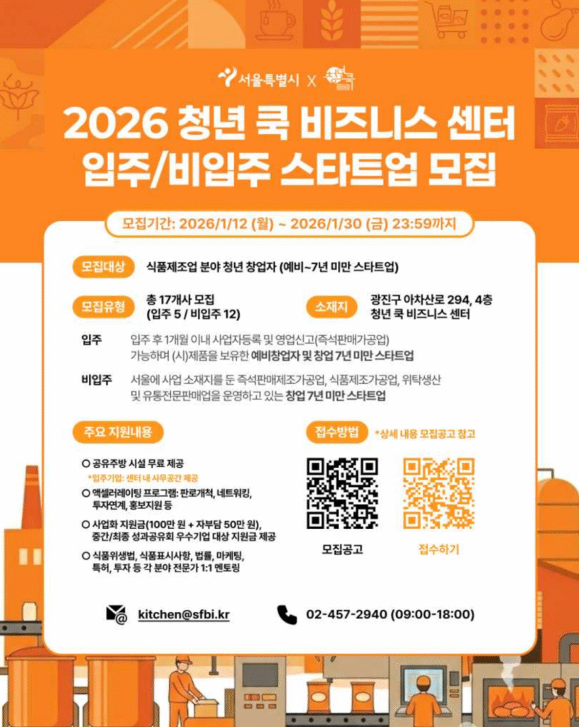 서울 광진구에 위치한 청년 쿡 비즈니스 센터가 2026년도 신규 참여 기업을 모집한다. 모집 기간은 1월 12일부터 30일까지이며, 서류와 면접 심사를 거쳐 총 17개사를 선발할 예정이다.