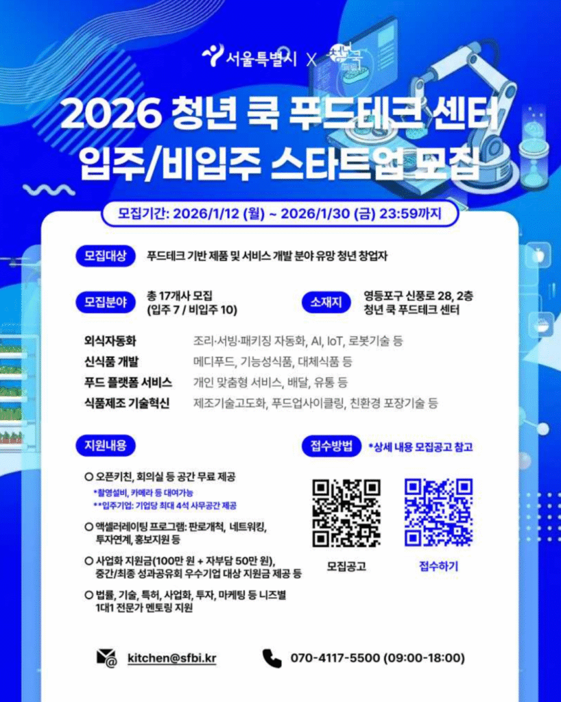 서울 영등포구에 위치한 서울시 청년 쿡 푸드테크 센터가 2026년도 참여 기업을 모집한다. 모집 기간은 1월 12일부터 30일까지이며, 입주기업 7개사와 비입주기업 10개사를 포함해 총 17개 스타트업을 선발할 예정이다.