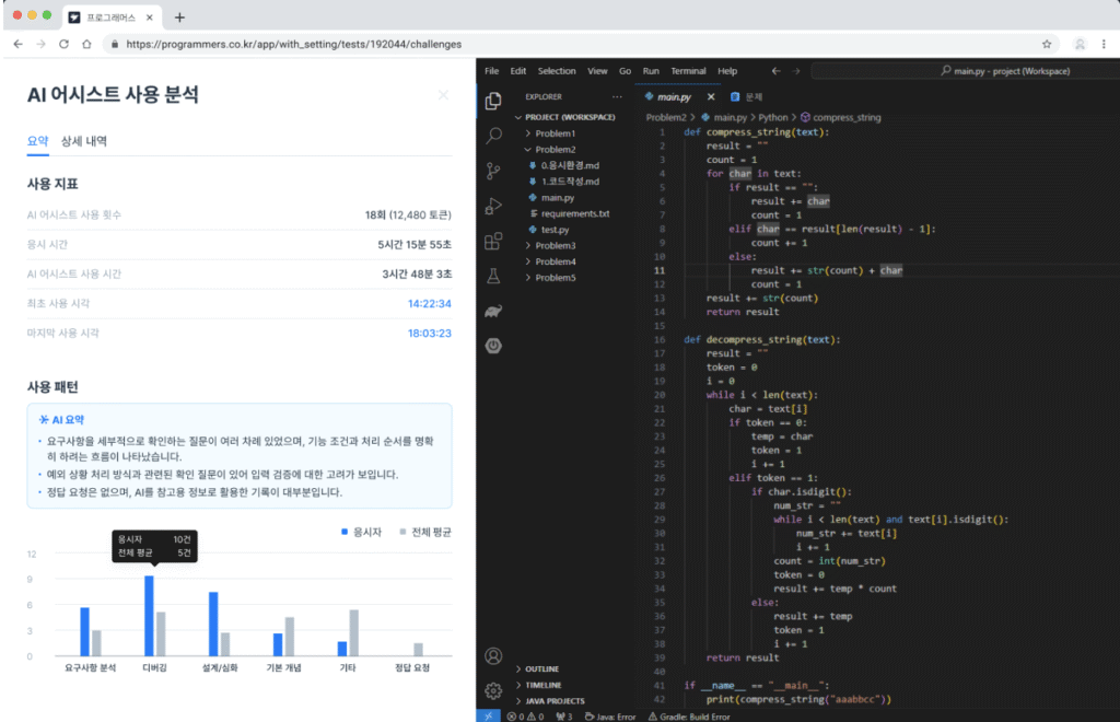 AI 어시스트는 표준화된 AI 환경을 제공해 응시자의 AI 협업 능력을 측정한다. 응시자는 실제 업무 환경과 유사하게 AI와 실시간으로 소통하며 코드를 생성하거나 오류를 수정할 수 있다. 채용 기업은 응시자가 제출한 결과물뿐 아니라 입력한 프롬프트의 품질과 AI 답변을 검증하는 과정까지 확인할 수 있다.
