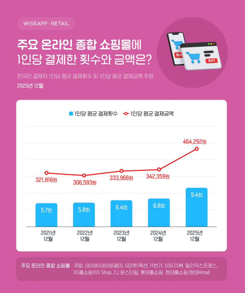 주요 온라인 종합 쇼핑몰의 1인당 평균 결제횟수와 결제금액을 조사한 결과, 2025년 12월 기준 결제횟수는 1인당 평균 9.4회로 전년 동월(6.8회) 대비 38% 증가한 것으로 나타났다.